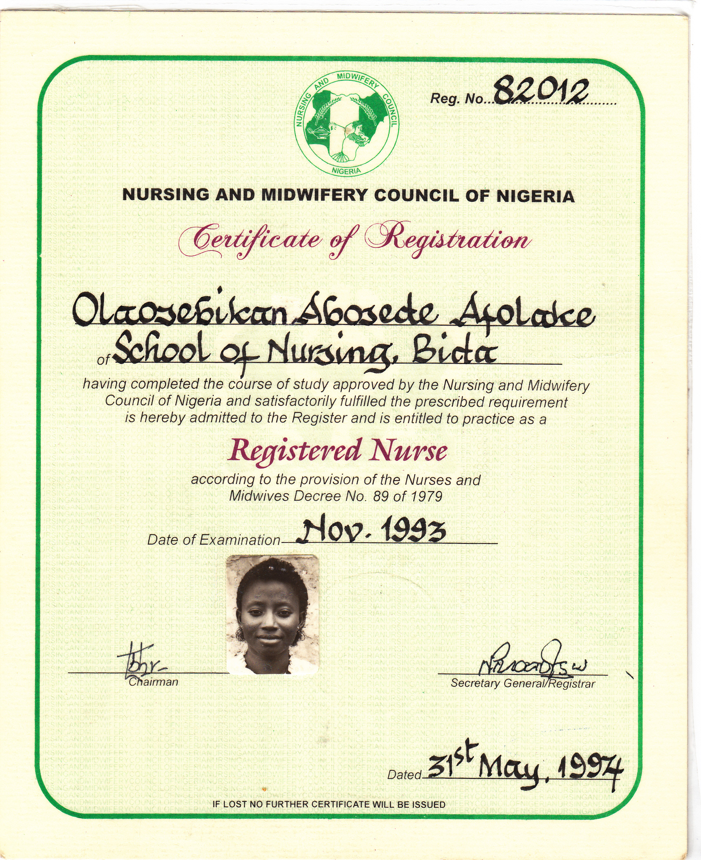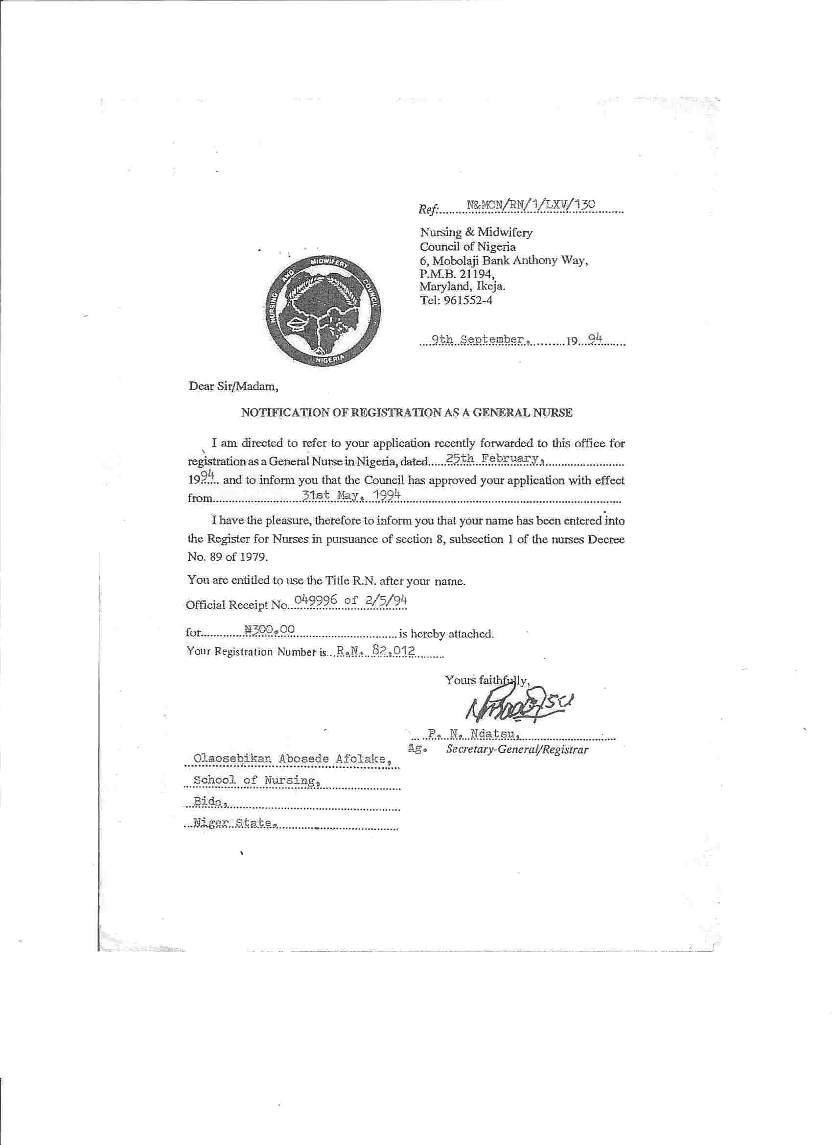 09/09/1994Registered as a Div 1 Nurse with the Nursing and Midwifery board of Nigeria