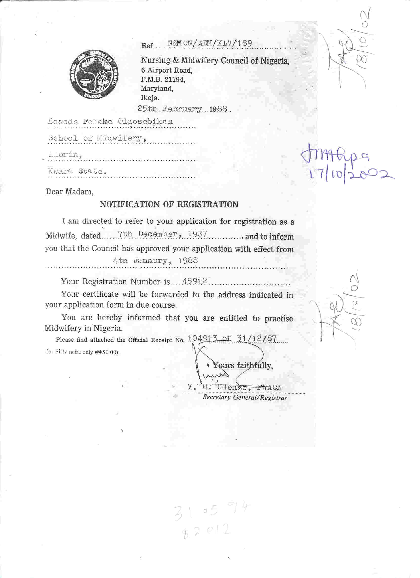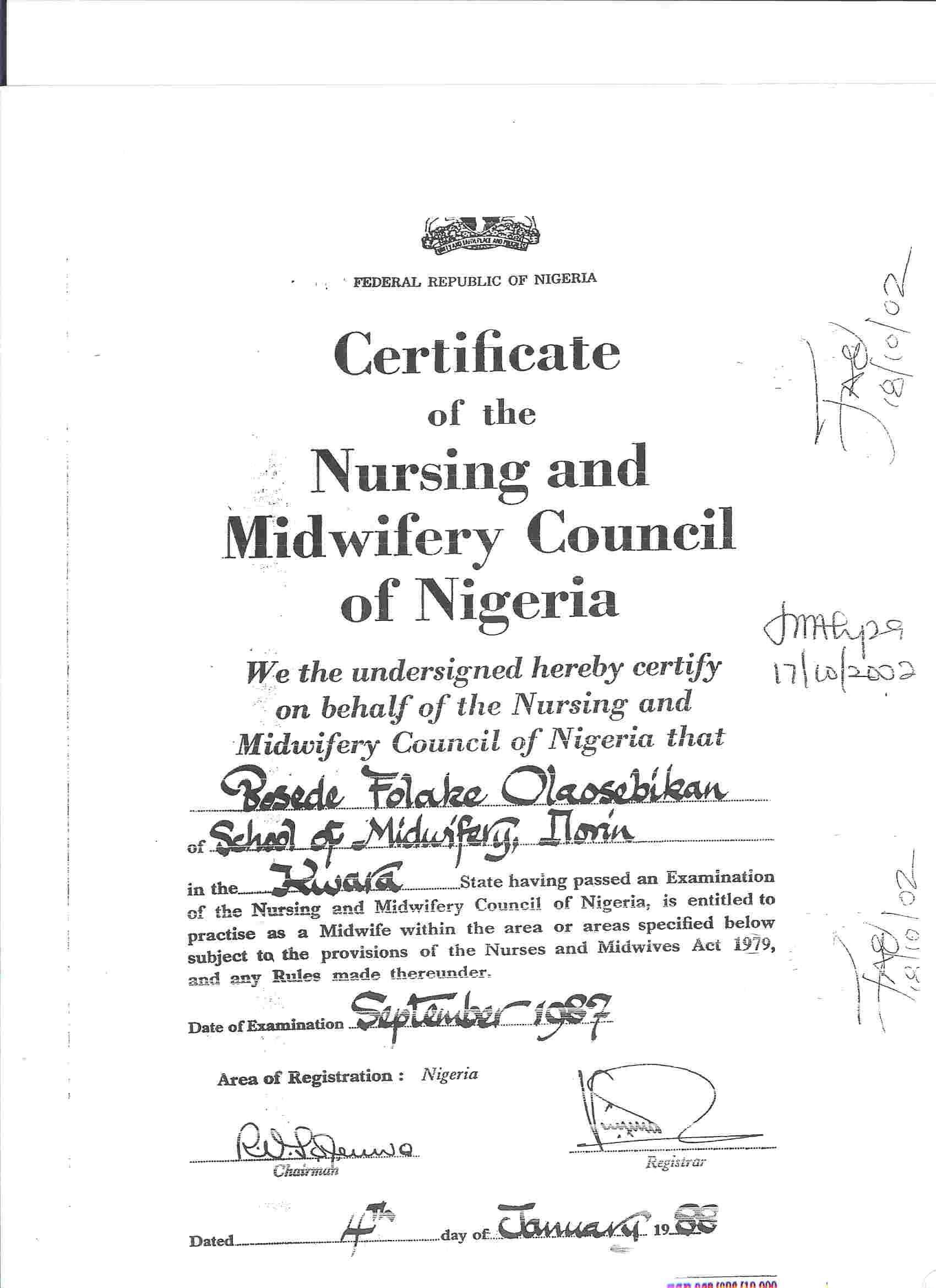 25/02/1988Registered as a Midwife with the Nursing and midwifery board of Nigeria