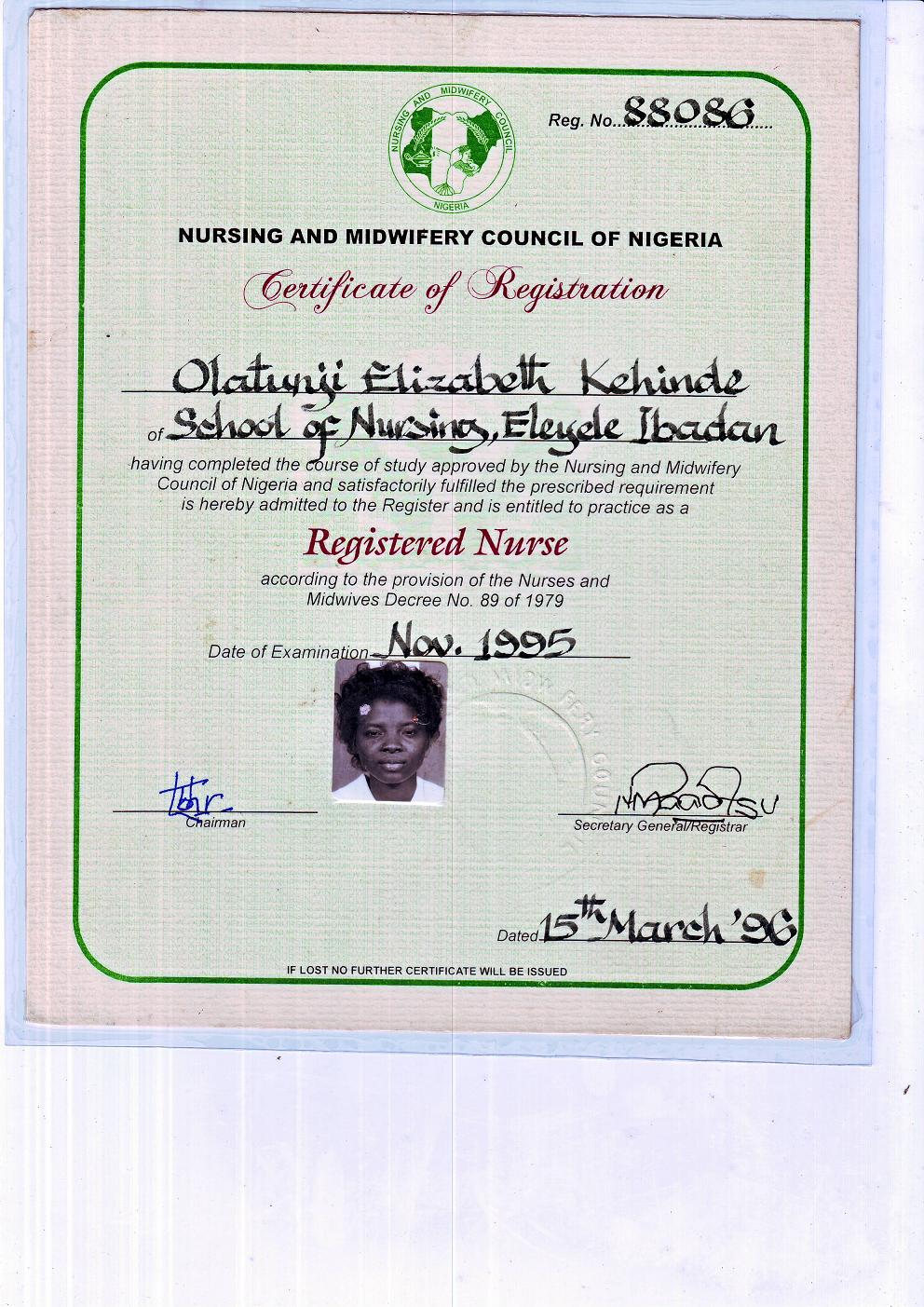 October,1992 - November, 1995My registration as a nurse in Nigeria followed a three-year certificate course in basic nursing at a tertiary level of education designed for students who wish to pursue nursing as a profession.