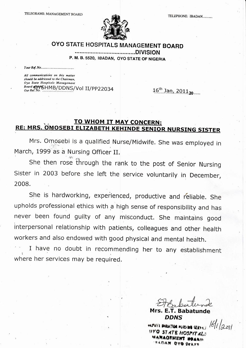 02/03/1999 - 21/12/20082007 - 2008 Oyo State Hospitals Management Board, Oyo States, Nigeria POSITION Senior Nursing Officer (Ophthalmic) Responsibilities: •Provision of client care in conjunction with Ophthalmologist. •Organised and co-ordinated appointments, medical tests, visual examinations. •Documentation & maintenance of client records •Medication inventory maintenance 2006 - 2007 Lagos University Teaching Hospital, Lagos, Nigeria POSITION: Ophthalmic Nursing Student. Responsibilities: •Eye examinations – Visual acuity, intra-ocular pressure .Minor clinical eye care/treatments – dressings, staining, dilatation. •Assisting in operative procedures. 1999 - 2006 Oyo State Hospitals Management Board, Oyo State, Nigeria 2003 - 2006 Senior Nursing Officer (General Nurse) – Dept. of Ophthalmology Responsibilities: .Organised and co-ordinated general nursing treatments and care for ophthalmic clients. •Care and client counselling of blind clients 2002 - 2003 Senior Nursing Officer (General Nurse) – Surgical Unit. Responsibilities: •Pre & Post-Op Nursing care. •Post-operative wound care •Administered medication – oral, IM, SC, Rectal, IV •Health Education / Discharge preparation •Client documentation as per organisational procedures. 2001 - 2002 Registered Nurse Midwife – (Ante-Natal Clinic) Responsibilities: •Pre-natal education •Pre-natal assessments – BP, Urinalysis, Weight, Abdominal palpation to assess foetal position/presentation, Foetal Heart Rate checks. •Post-natal client education Registered Nurse Midwife – (Maternity Unit) Responsibilities: •Labour and peri-natal client care. •Conducted normal deliveries •Prepared & monitored clients requiring induction (Pitocin Infusion) and augmentation. •Admissions / Discharges of patients. •Supervised student nurses and midwives. 1999 - 2001 Registered Nurse – (Medical Unit) Responsibilities: • Assessment, planning, implementation and evaluation of client care based on nursing care plan. •Medication administration •Followed infection control and isolation procedures •Participated in on-going in-house research and clinical training, professional development.