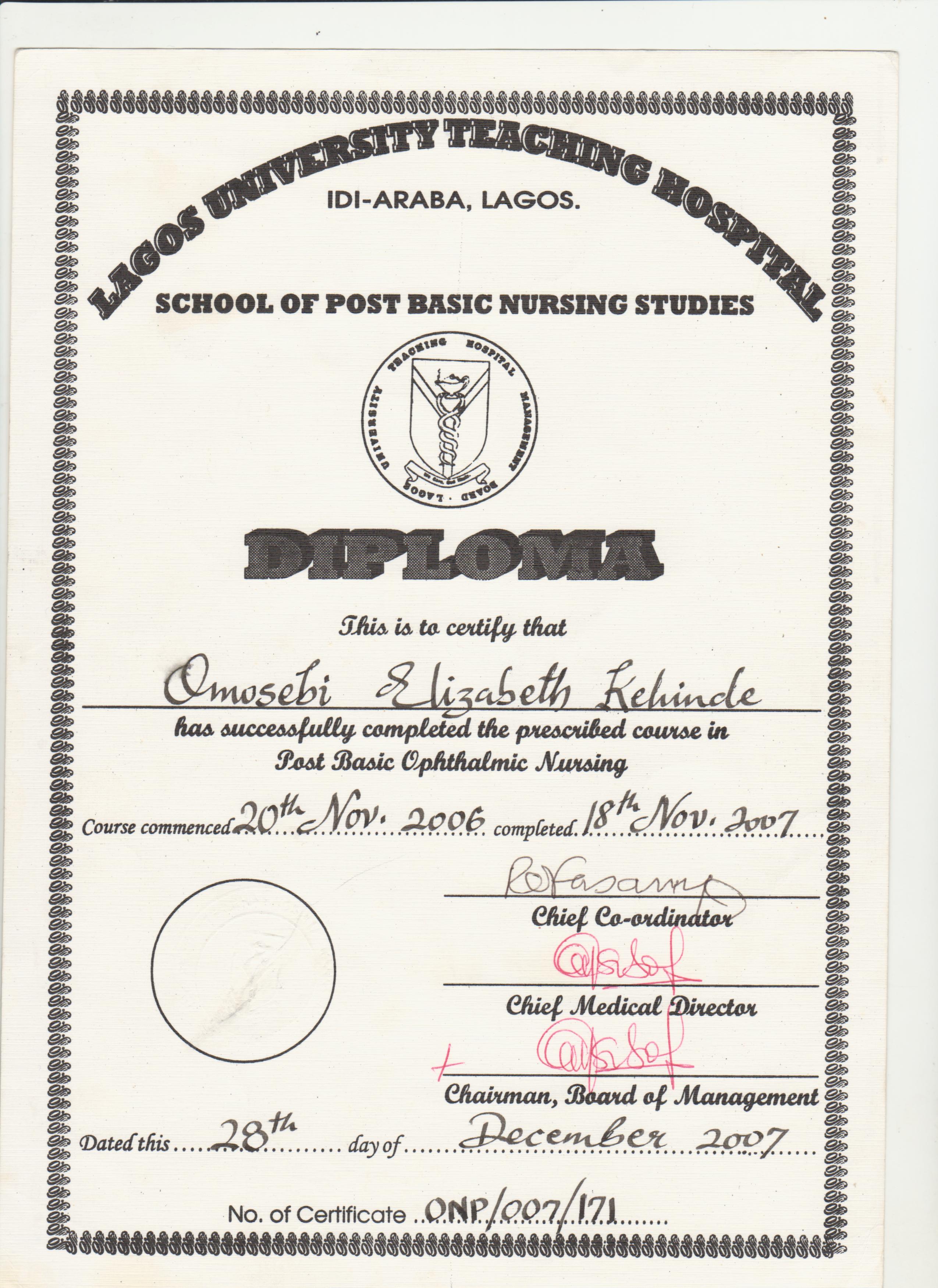 20/11/2006 - 18/11/2007My Certificate as a registered ophthalmic nurse was awarded following a one year specialised post-basic study in ophthalmic nursing. This entailed the care of blind patients; the prevention of blindness; diagnosis and treatment options of various eye diseases.