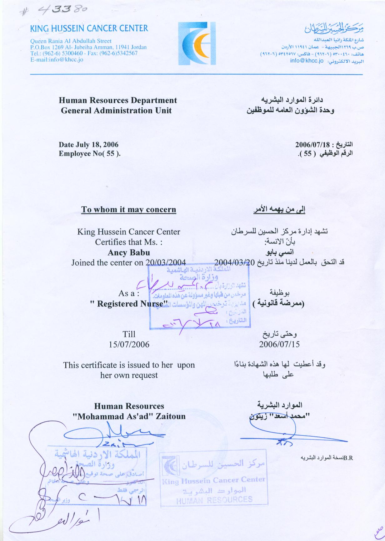 November 2006 - November 2008Registered Nurse Div 1 at King Hussein Cancer center Jordan