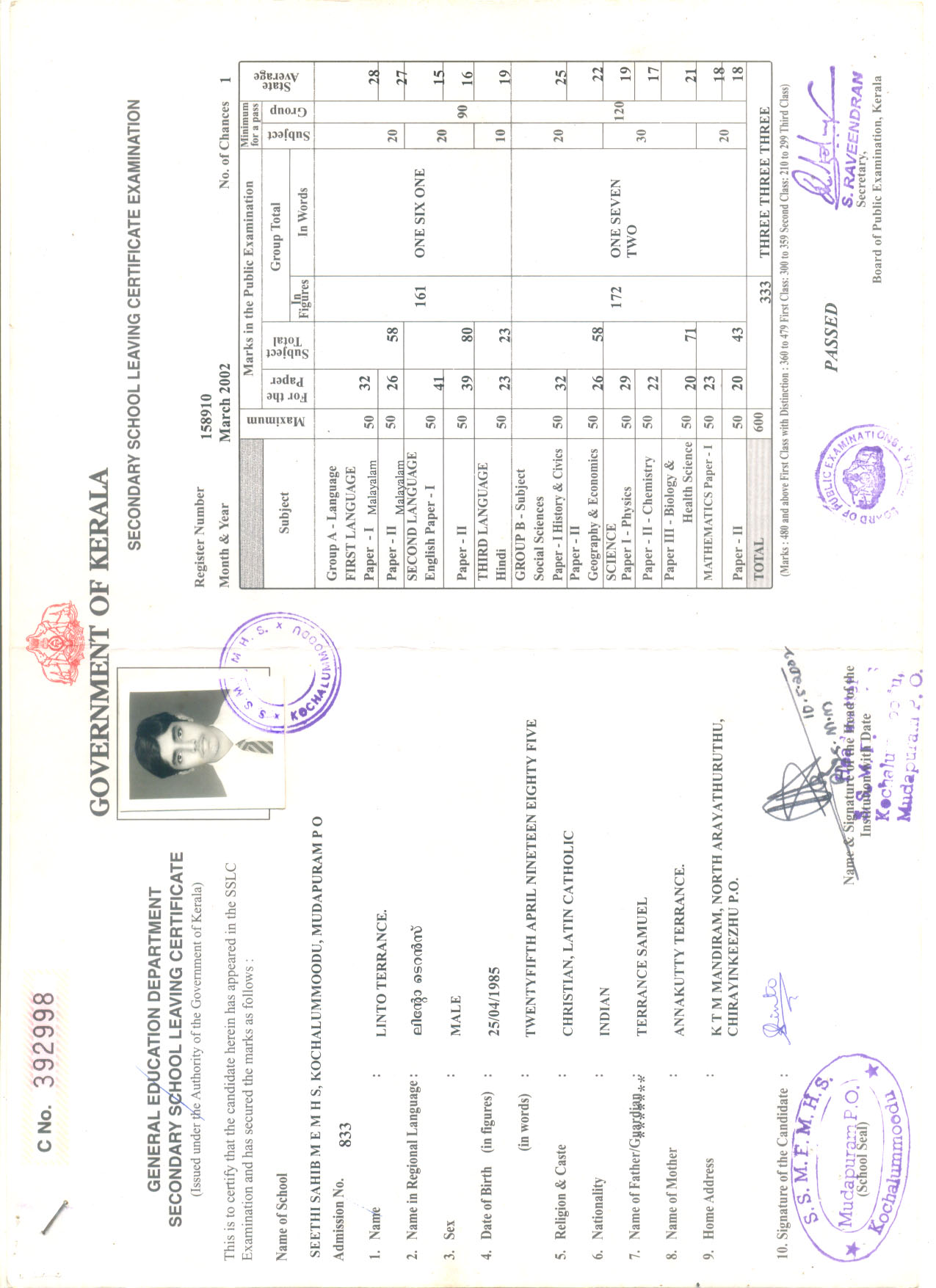 Secondary school leaving certificate (1Oth standard) at SEETHI SAHIB MEMORIAL ENGLISHMEDIUM HIGH SCHOOL,