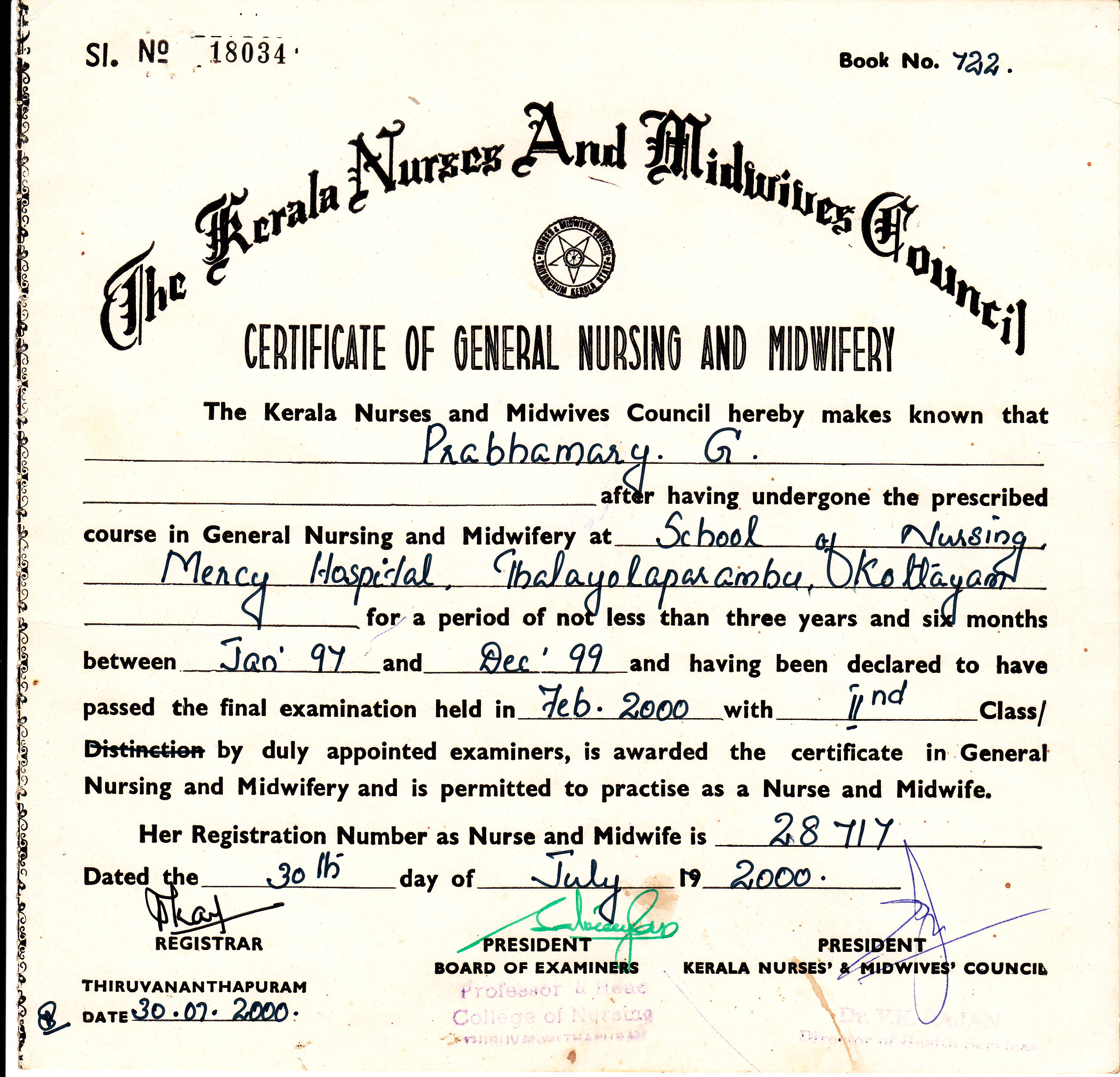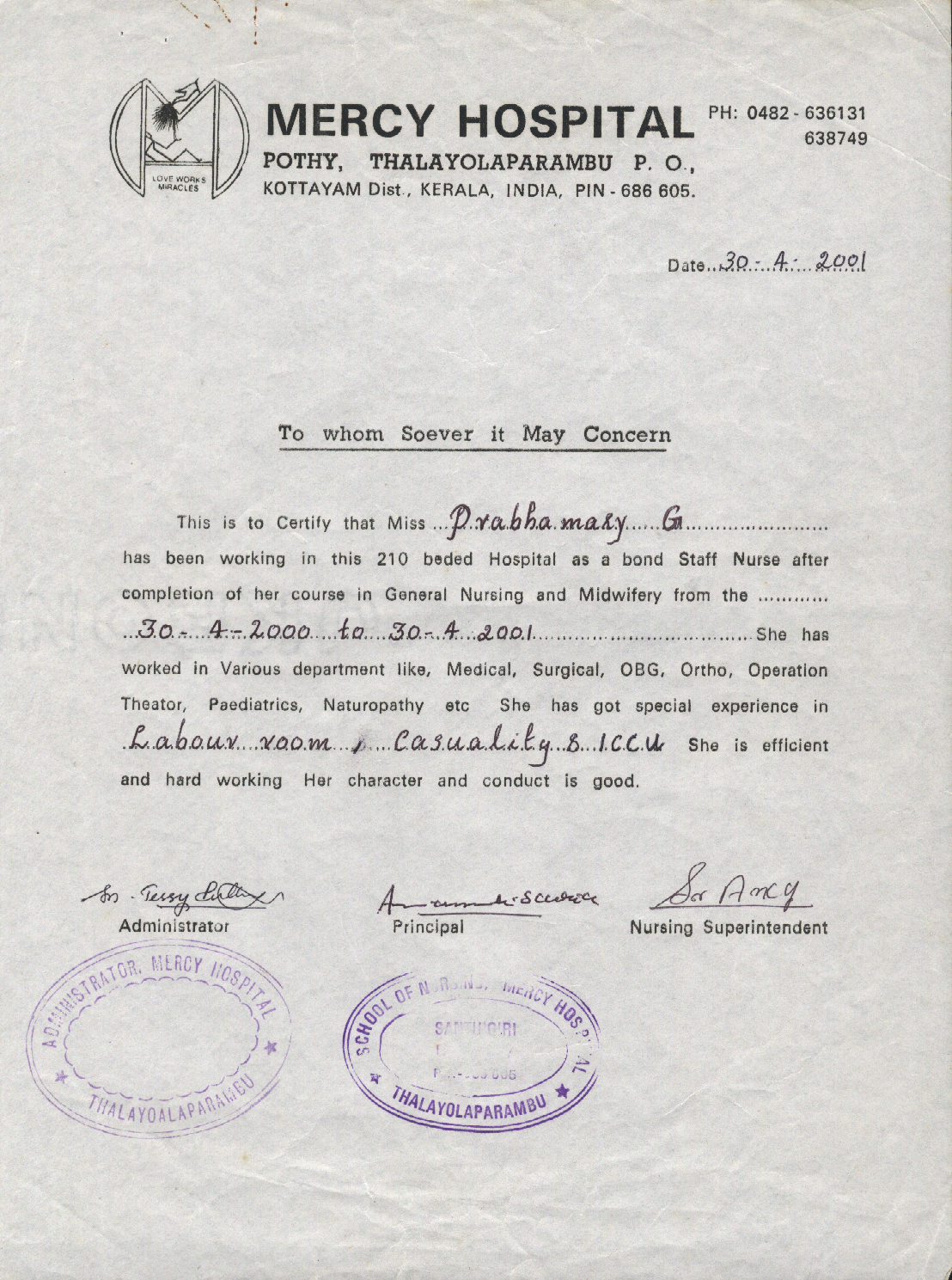 02-07-2001 - 30-11-2002Registered Nurse at Mercy Hospital, Kerala, India.