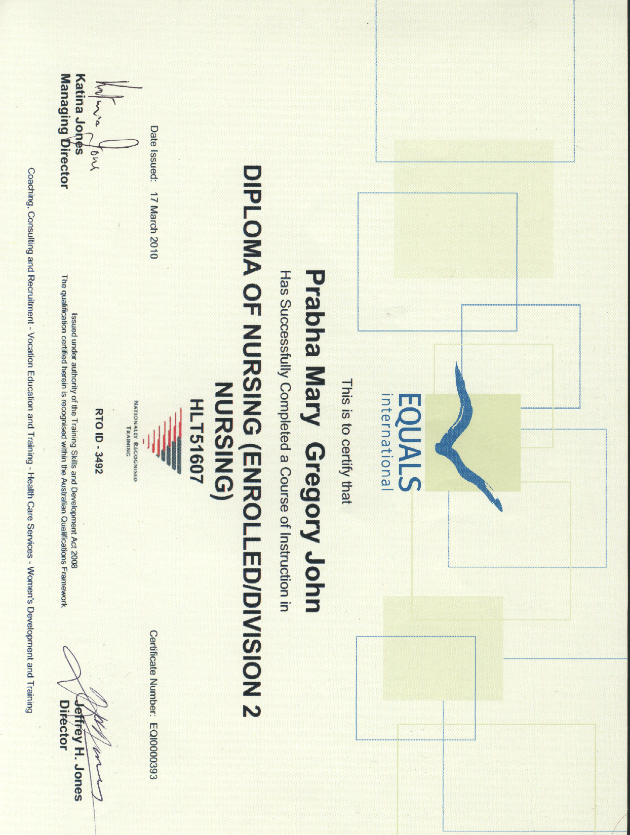 13-03-2012 - 13-03-2013Diploma of Nursing (Enrolled/Division 2 Nursing) at Equals International, South Australia.