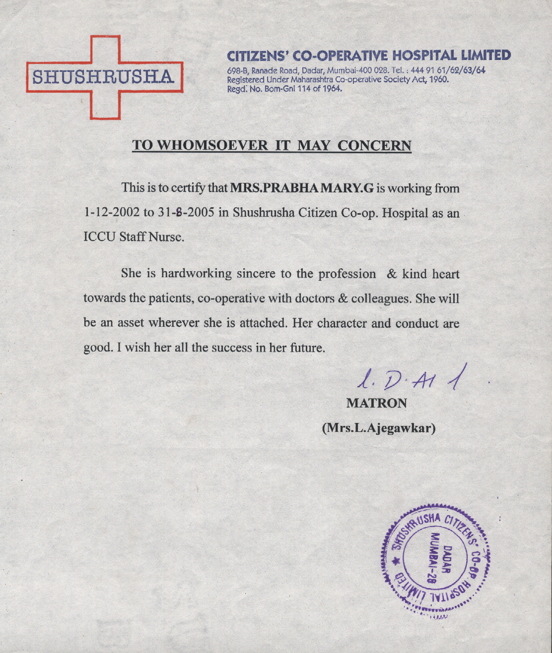 15-09-2005 - 30-07-2008Registered Nurse at Shushrusha Citizen's Co- operative Hospital, Mumbai, India.